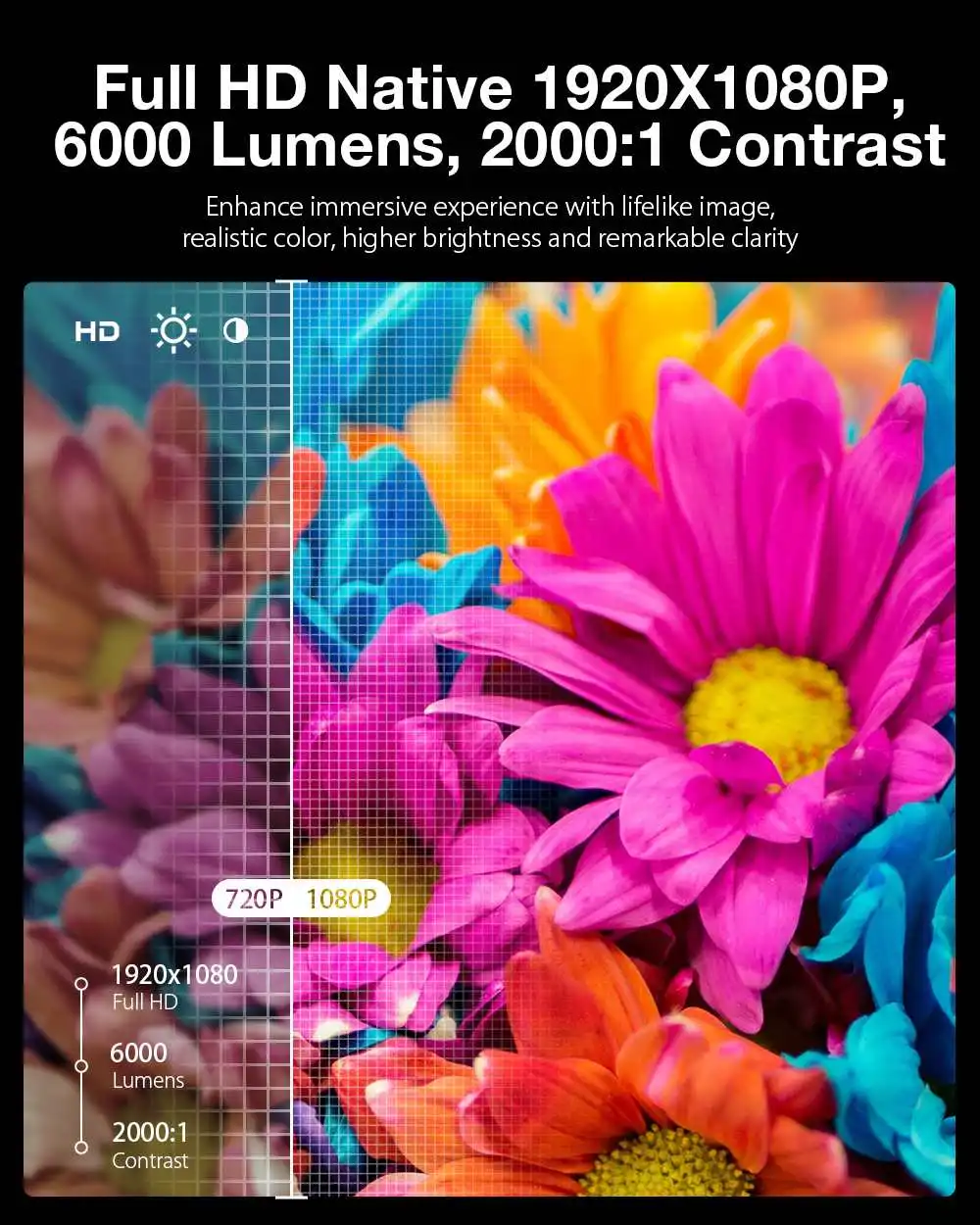Full HD Native 1920X1080P 6000 Lumens, 2000:1 Contrast