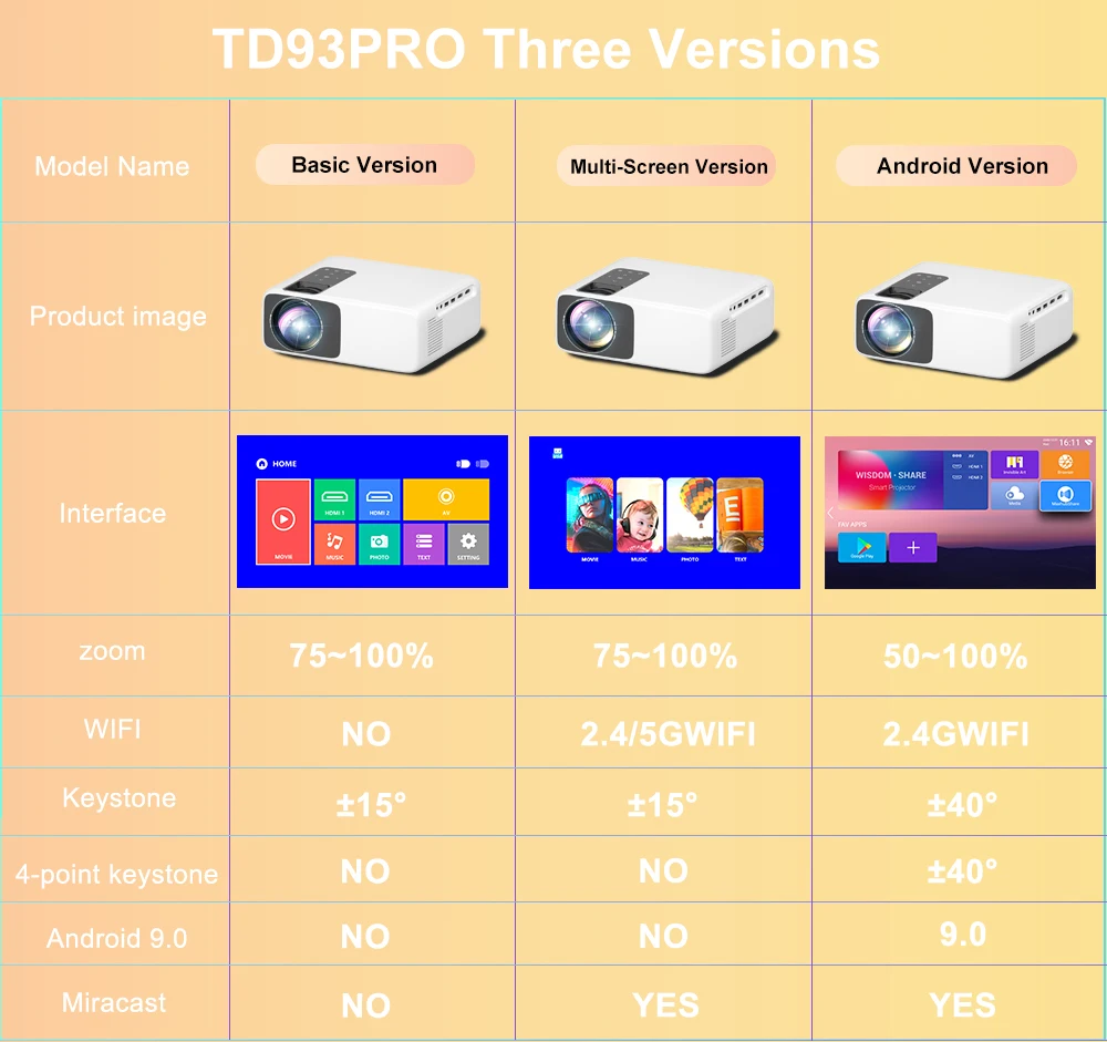 TD93Pro Baisc and Multiscreen Version support +/-15 Degree Keystone