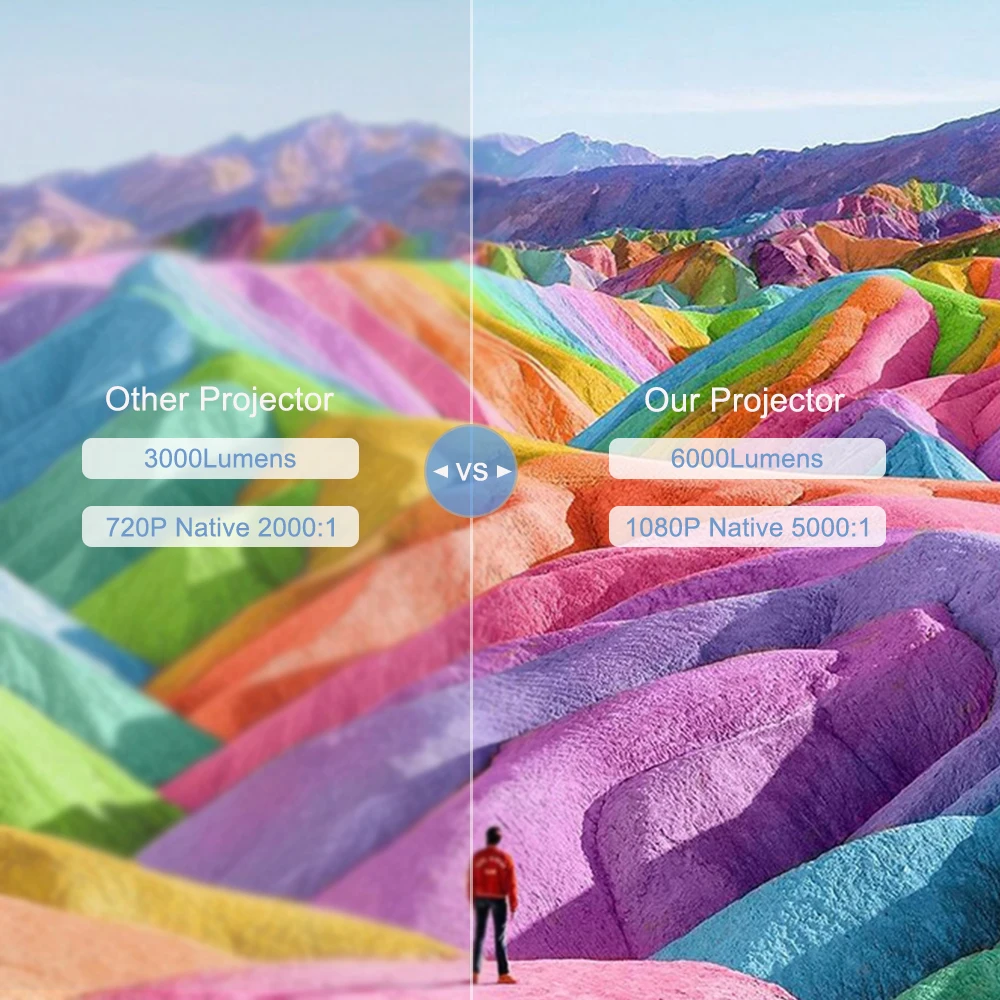 Our projector utilizes the bright LED light and lcd display technology, with 6000Lumens high brightness significantly provides over 60+% brightness than other mini projector